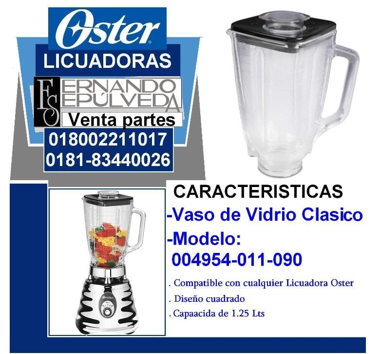 En Fernando Sepúlveda somos distribuidores de refacciones marca Oster y taller de servicio tanto dentro como fuera de garantía de línea licuadoras, contamos con refacciones originales , dentro de los accesorios mas comunes y utilizados en la cosida seria: Los vasos de vidrio clásico modelo 004954-011-090, capacidad de 4.250 Lts compatible con cualquier licuadora oster con diseño cuadrado.