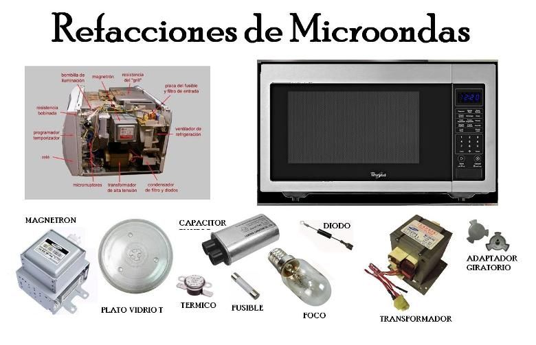 NOMBRAREMOS  LAS REFACCIONES MAS COMUNES A CAMBIAR AL MOMENTO DE UN DESPERFECTO EN UN MICROONDAS, PUEDEN SER DIFERENTES LOS CAUSANTES DEL MOTIVO DEL DESPERFECTO Y SE RECOMIENDA ACUDIR A UN TECNICO EXPERTO PARA QUE REALICE LA COMPOSTURA DEL MISMO EQUIPO YA QUE SE ESTA TRABAJANDO CON ALTA CORRIENTE, UNO DE LAS RAZONES DEL CUAL ESTA RECOMENDACION ES QUE A CADA ELEMENTO DAÑADO HAY QUE HACERLE PRUEBA DE FUNCIONAMIENTOY PARA ESTO ES NECESARIO EQUIPO ADECUADO Y LISTAMOS A CONTINUACION LOS SIGUIENTES COMPONENTES.